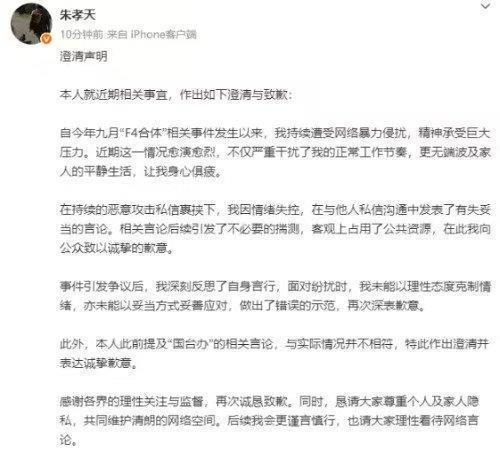 他突然就在社交平台回应,自己是因为最近被F4的事情陷入争议,情绪有点失控,给大家都都造成了不好影响。 他承认了自己说的话,与实际不符合,现在已经认识到了自己的错误。