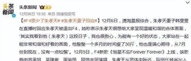 12月6日朱孝天的妻子韩雯雯在网上回应了朱孝天被踢出F4的事情。 韩雯雯曝出了朱孝天对F4的付出,为了合体一个月暴瘦了30斤,就是为了想要给粉丝呈现一个温暖和谐的F4。