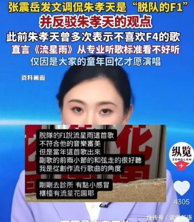他还直言自己是从专业听歌的角度去评价《流星雨》的。 关于朱孝天对《流星雨》的评价,专业歌手张震岳就发文回应,他先是调侃了朱孝天时“脱队的F1”,接着表示自己从流行音乐的角度分析,这首歌很好听。
